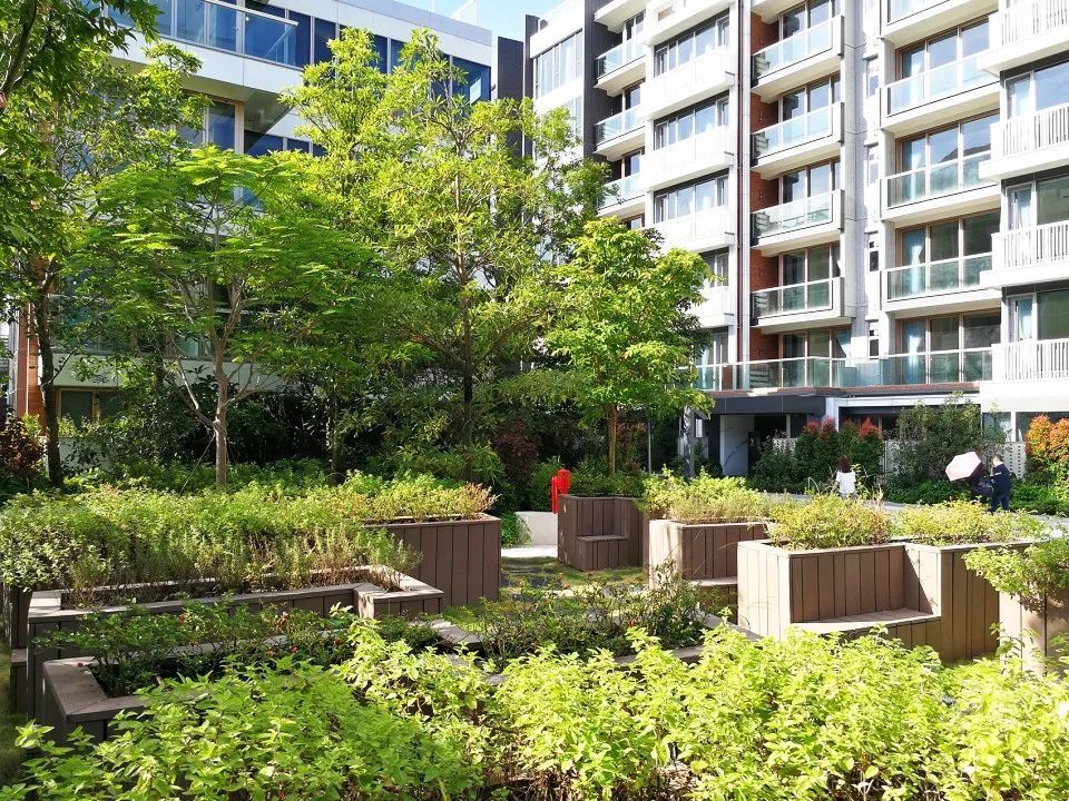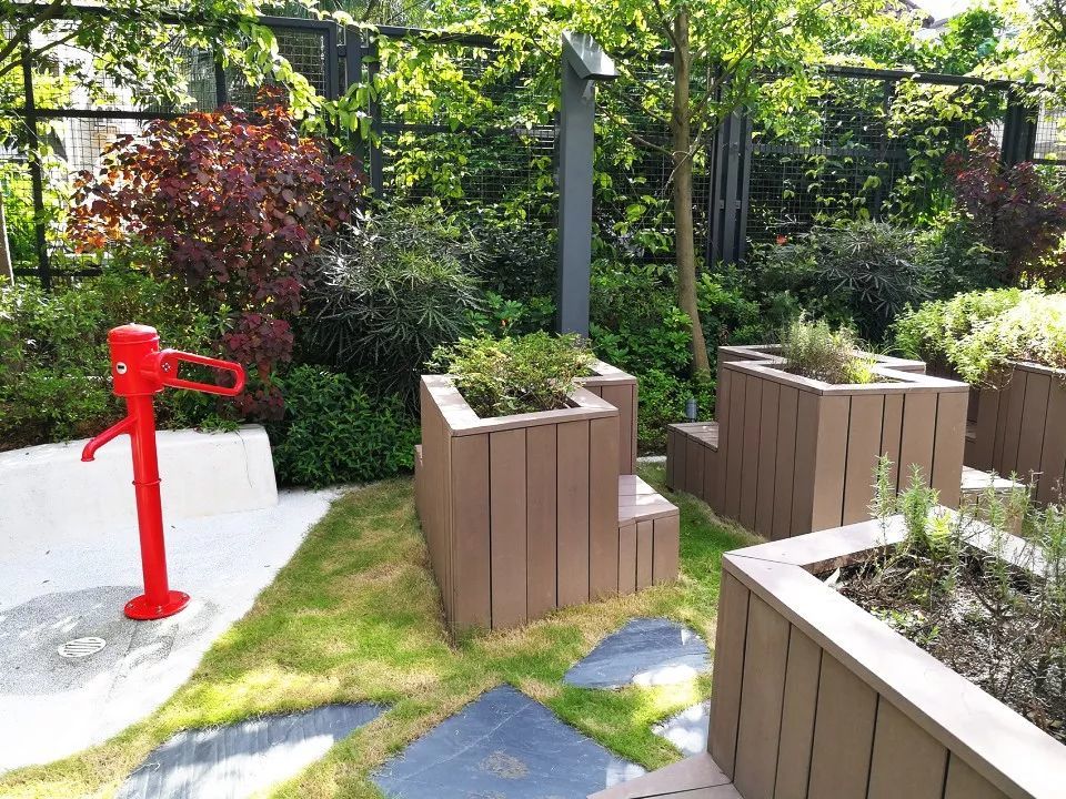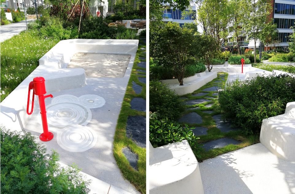 第一个区域是自行车停放处,然后是摆满花槽的第二个区域。再往前走是第三个区域——教学区,里面有长凳和综合药草园,孩子们可以在小沙坑里游戏或者玩水。最后一个区域是关于“食物和社区”的。这是一个比较私密的空间,小区住户可以在这儿会面,开个烧烤party。