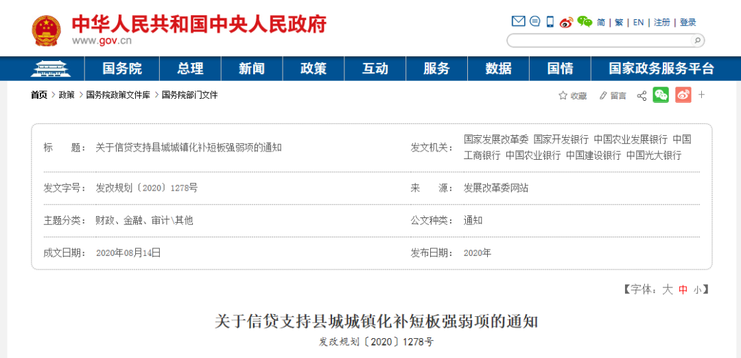 关于信贷支持县城城镇化补短板强弱项的通知 发改规划〔2020〕1278号