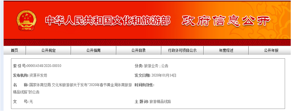 为深入贯彻党的十九大精神,全面落实“健康中国”国家战略,践行“绿水青山就是金山银山”“冰天雪地也是金山银山”的发展理念,促进体育产业与旅游产业融合发展,满足人民群众节假日期间多样化的体育旅游需求,国家体育总局、文化和旅游部联合发布“2020年春节黄金周体育旅游精品线路”。它们是: