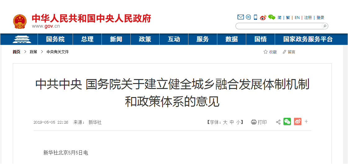 中共中央 国务院关于建立健全城乡融合发展体制机制和政策体系的意见
