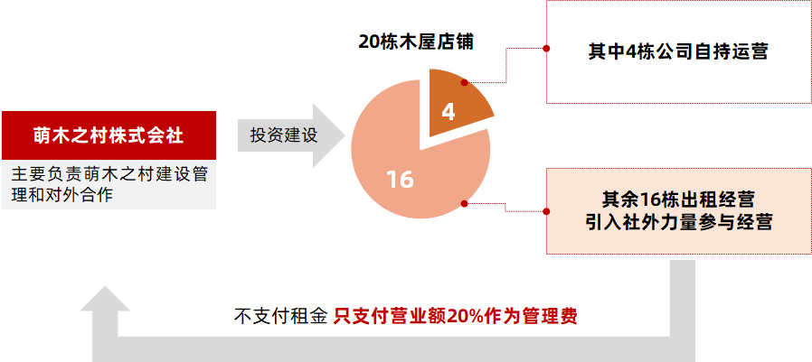 在小镇平台化管理之下,除了整合内部资源外,积极寻求外部力量参与到小镇的经营。株式会社建设了20栋木屋,其中4栋自持运营,其余16栋出租运营,在当年提出创新式“零租金”的方式进行租赁,即不收租金只收取营业额的20%作为管理费,全部出租完成。每个月店主都会组织聚会探讨“生意经”,互相交流,共促发展。通过这样的形式,萌木之村株式会社和这些小镇店铺经营者形成了利益共同体,成就了萌木之村成为乡村旅游度假的标杆项目。