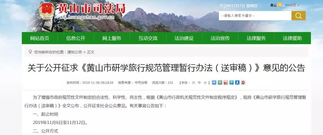 11月6日,黄山市司法局全文公布《黄山市研学旅行规范管理暂行办法(送审稿)》,11月6日至11月12日,社会公众可以通过信函、电邮、电话等方式,提交意见建议。