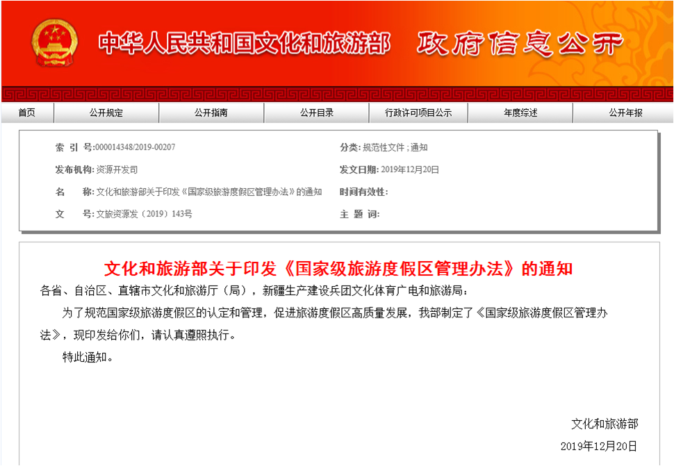 第五条 国家级旅游度假区的认定和管理由文化和旅游部按照本办法和国家标准《旅游度假区等级划分》(GB/T26358)及相关细则组织实施,具体工作由文化和旅游部资源开发司承担。