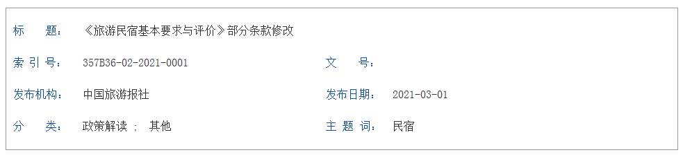 文化和旅游部日前发布旅游行业标准《旅游民宿基本要求与评价》(LB/T 065-2019)第1号修改单,对旅游行业标准《旅游民宿基本要求与评价》中的部分条款进行了修改,新增民宿“提供餐饮服务时应制定并严格执行制止餐饮浪费行为的相应措施”条款,并将旅游民宿等级由三星级、四星级、五星级更改为丙级、乙级、甲级。
