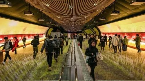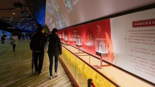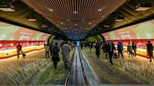 这片稻田所处的位置是上海地铁最繁忙的站点之一——徐家汇地铁站,稻田所在的换乘通道是上海地铁的地标,每天换乘客流达四十万。通道地面采用裸眼3D式的海水稻地贴使人仿佛置身稻田之间。结合两侧长达23米的巨型投影,让身处钢筋丛林的乘客们走进这条通道,身心感受到田园劳动的美好。同时,在两侧23米的长廊上,向乘客们真实展示了海水稻“本稻”。金黄色的稻谷颗粒饱满,当盐碱的不毛之地变成了良田,不知袁隆平院士和他的团队为之奉献了多少精力。