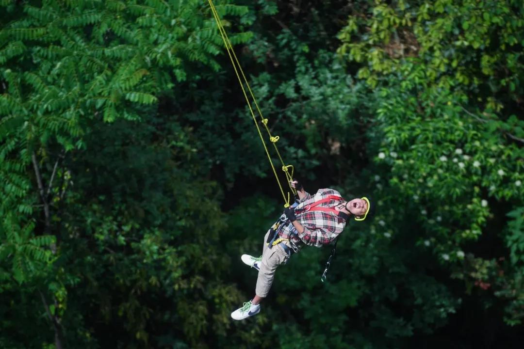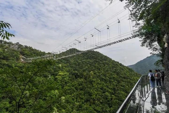 有“华东第一石林”之称的云上石林景区,在今年五一假期期间推出了“王者级” 运动项目——“仙谷桥千”。在两座山形成的峡谷中,一座天堑桥、一条钢丝绳和一个大秋千组成了“桥千”。天堑桥为木板吊桥,悬空连起两座山,长约160米,高度120米(相当于40层楼高)。
