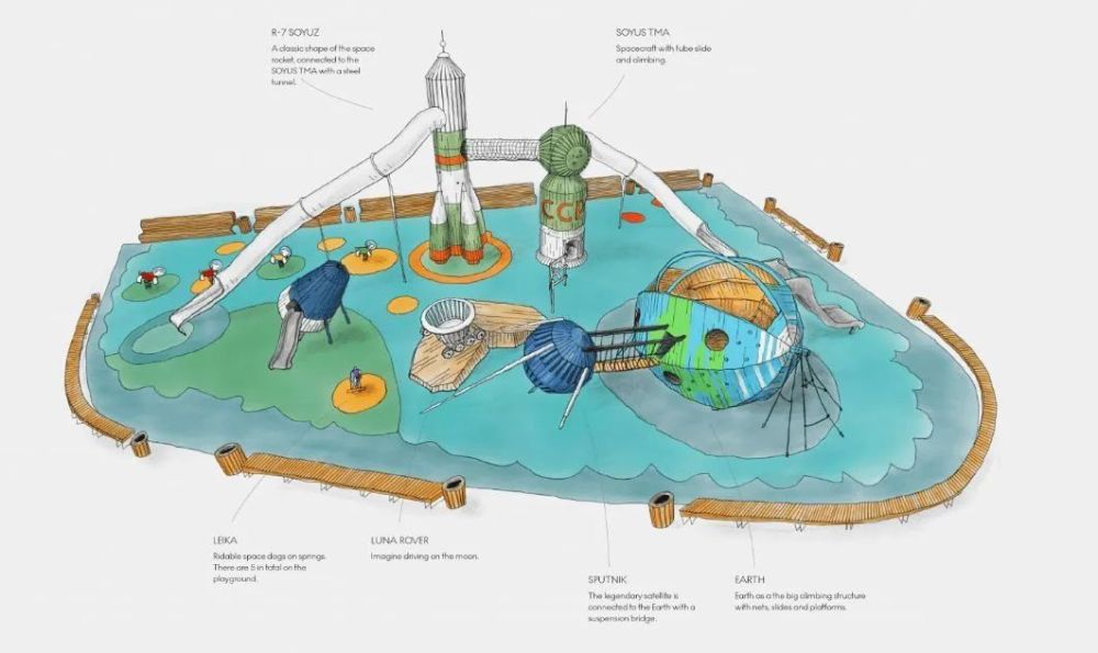 巨大的木结构构成了一个场景,其中可以展开不同的冒险。小朋友可乘坐俄罗斯太空计划的航天飞机和车辆,以便于进一步了解。