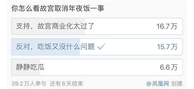 一个近40万人参与的投票显示,认为商业化太过了和认为故宫不该取消年夜饭的人数基本持平。
