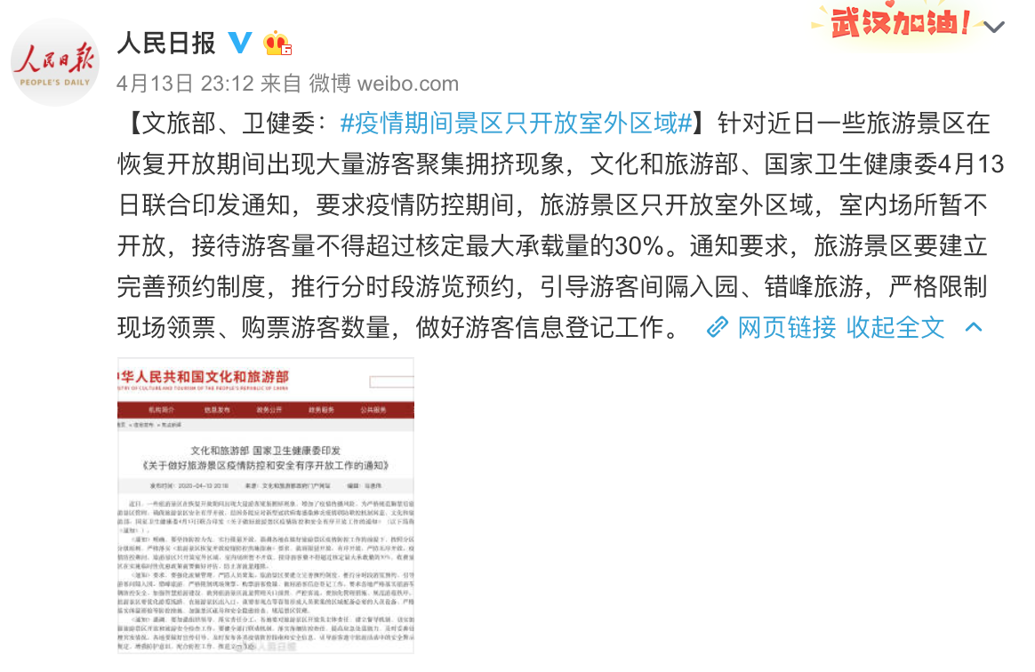 为严格规范解禁后旅游景区管理,确保旅游景区安全有序开放,经国务院应对新型冠状病毒感染肺炎疫情联防联控机制同意,文化和旅游部、国家卫生健康委4月13日联合印发《关于做好旅游景区疫情防控和安全有序开放工作的通知》(以下简称《通知》)。