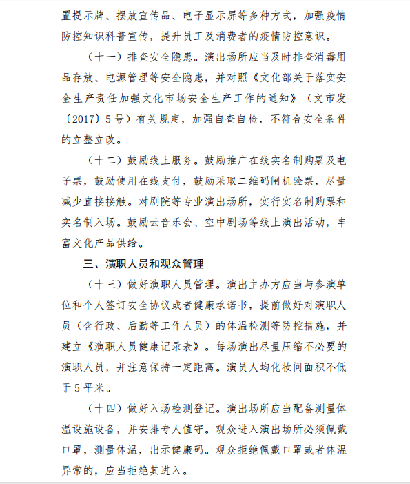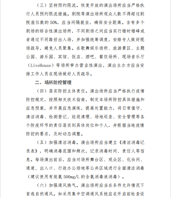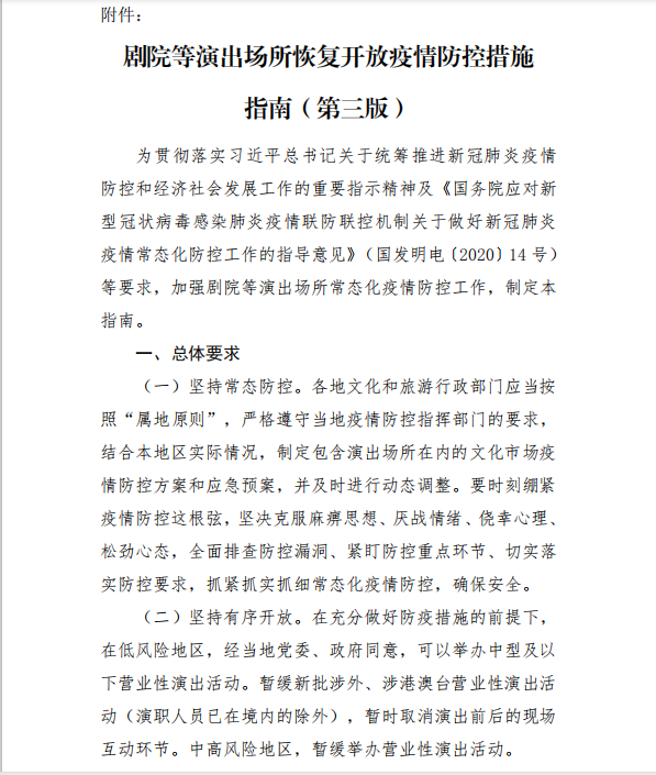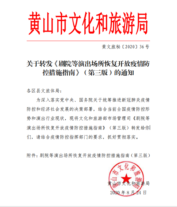 8月24日,黄山市文化和旅游局发出通知,转发文化和旅游部市场管理司《剧院等演出场所恢复开放疫情防控措施指南》(第三版),要求各区县文旅体局抓好贯彻落实,加强剧院等演出场所常态化疫情防控工作。