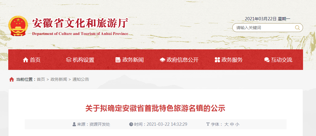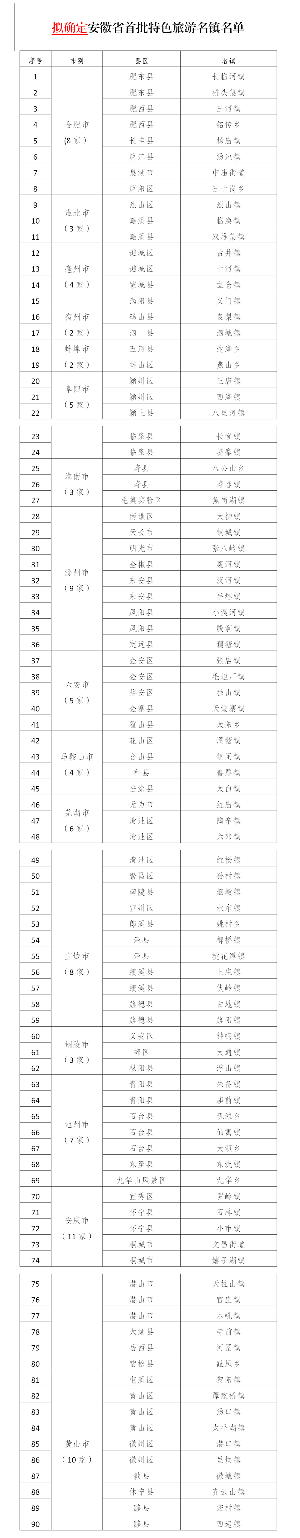 3月22日,省文化和旅游厅发布公示,为贯彻落实《安徽省人民政府关于促进全域旅游发展加快旅游强省建设的实施意见》(皖政〔2019〕41号)精神,大力推进乡村旅游发展,助推乡村振兴,充分发挥乡村旅游品牌的示范带动作用,经各市申报、专家评审和综合评议,拟确定合肥市肥东县长临河镇等90家单位为安徽省首批特色旅游名镇。