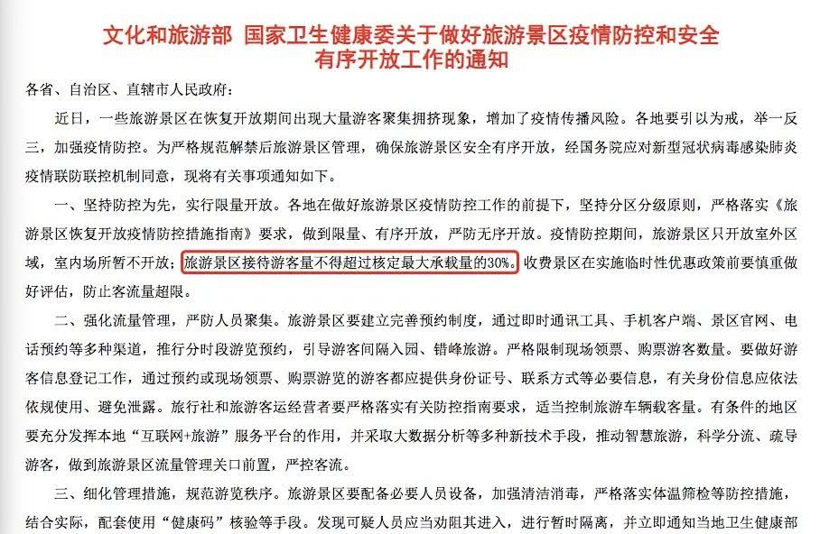 近日,一些旅游景区在恢复开放期间出现大量游客聚集拥挤现象,增加了疫情传播风险。各地要引以为戒,举一反三,加强疫情防控。为严格规范解禁后旅游景区管理,确保旅游景区安全有序开放,经国务院应对新型冠状病毒感染肺炎疫情联防联控机制同意,现将有关事项通知如下。