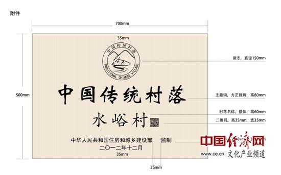 据悉,保护标志由中国传统村落徽志、主题词、村落名称、二维码、监制单位、公布日期等6部分组成,村落名称为公布列入中国传统村落名录的具体村落名称,不写其所在的乡镇、县(市、区、旗)、市(州、盟、地区)及省(市、自治区),二维码为该村链接到中国传统村落数字博物馆的标记。公布日期为公布该村列入中国传统村落名录的具体年月。公布日期为公布该村列入中国传统村落名录的具体年月。各地也可根据实际情况按一定比例放大制作成碑状标志牌,但文字、内容等应与保护标志要求一致。民族自治地区可另外矗立少数民族文字书写(镌刻)的标志牌,内容应与汉字内容相同。