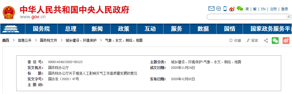 近年来,我国人工影响天气工作快速发展,作业能力和管理水平不断提升,在服务农业生产、支持防灾减灾救灾、助力生态文明建设和保障重大活动等方面发挥了重要作用。为推进人工影响天气工作高质量发展,经国务院同意,现提出以下意见。