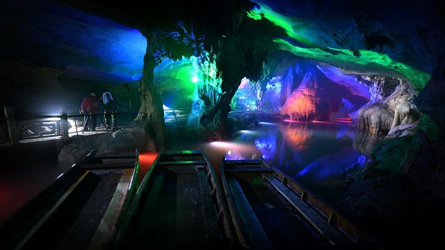 位于石台县七都镇境内,此洞似蛟龙曲折蛰伏于山下,故名“鱼龙洞”。洞口呈鳄鱼嘴形,宽8米,高5米,倒挂钟乳石犬牙交错,下颌成池,水色澄碧,终年不涸。洞体气势宏伟壮观,钟乳交错,溪水甘碧、四季如春、恒温不变,水域宽阔可乘舟游弋,美不胜收,实为人间仙境。明代何尹的“清泉出碧壑,红日映苍岩;绝妙鱼龙洞,尘壤别一天”的诗句,是对鱼龙洞最恰当的绝唱。