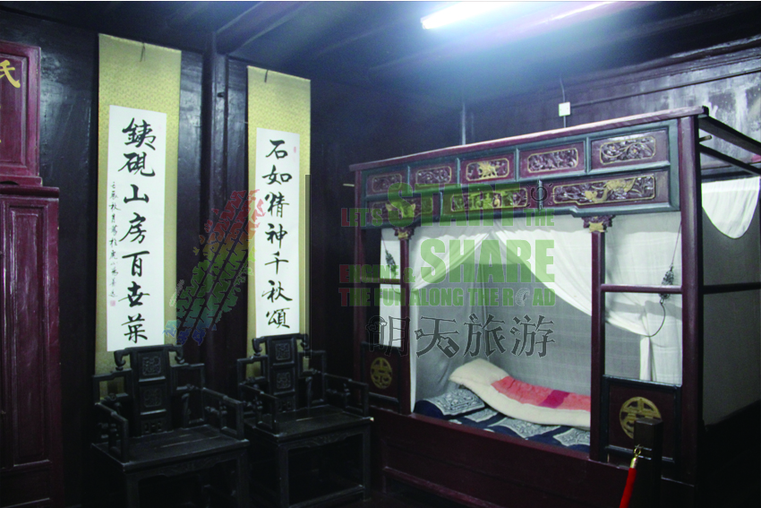 第二进是起居室,文化站先后从合肥、南京等地搜集了严凤英的遗物。已经永久凝固在某一固定的时刻的座钟,纯木打造的梳妆台,纺车,摇篮,雕花木床,衣柜,炭炉……堂屋供台上摆放的全家福照片,似乎向我们揭开了一户人家平凡而简单的生活。如果说铁砚山房、世太史第的文化味较浓的话,严凤英故居可说是真正意义上的故居。