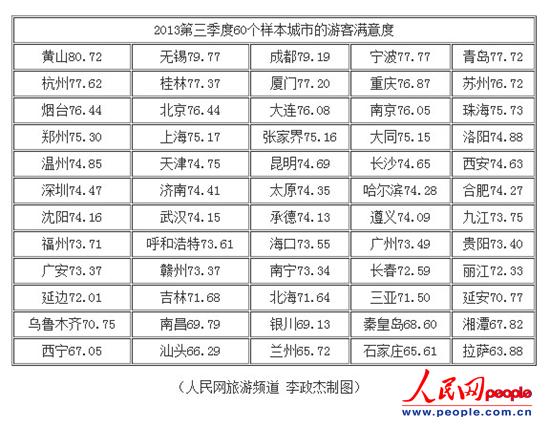 10月14日下午,中国旅游研究院在人民网发布2013年第三季度全国游客满意度调查报告,今年三季度,黄山、无锡、成都三市列游客满意度前三位,对比2013年第二季度数据,黄山、成都的满意度相对稳定,黄山市由第三位上升到第一位,遵义从五十位上升到三十三位,而北京由第四位下降到第十二位。