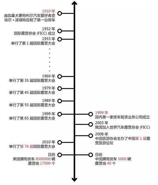 我国房车发展起步较晚,相比国外发展进程,整整晚了90年。目前房车拥有量和露营地建设数量都远远落后于欧洲、美国、加拿大、日韩等国家,其中房车和露营地数量均是美国的1/1000。