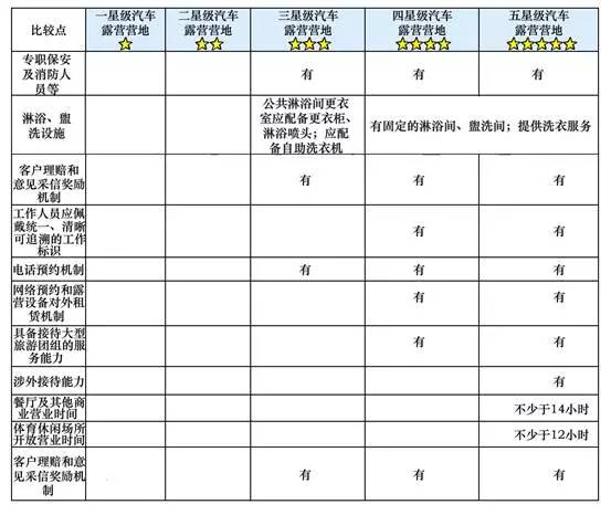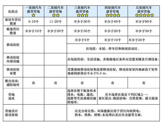 符合汽车露营地一般开放条件和三星汽车露营地要求;旅车营位数量不少于40个,帐篷营位数量应不少于20个,移动房车不少于10个;汽车露营营地至少选择靠近下列区域之一,景区景点、海滨浴场、自然景观、露天温泉;