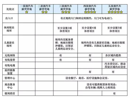 符合汽车露营地一般开放条件和四星汽车露营地要求;旅车营位数量不少于80个,帐篷营位数量应不少于20个,移动房车不少于20个;设置至少4项体 育项目;需要设置便利店,餐厅及其他商业设施营业时间不得少于14小时,体育场馆开放营业时间不得少于12小时;具备涉外接待能力;汽车营区位,移动房物 内需要设置电视,营地内各区域需要提供免费上网服务。