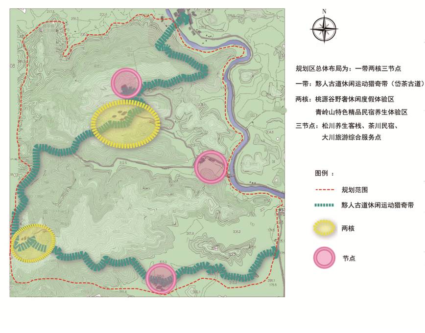 根据规划区的旅游资源类型和时空分布、旅游六要素,遵循旅游区空间布局的整体、有机、临近性原则,将黟人·桃花源休闲养生度假区分为:一带、两核、三节点