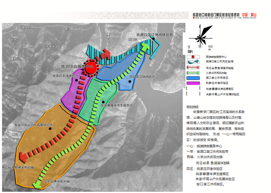 利用依山面水和垂直分异格局,挖掘资源特色,创新资源价值,以人性化、人本化、科学化为指导思想科学合理布局产品,优化空间布局。
