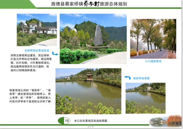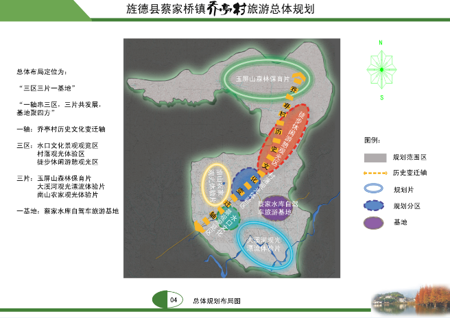 根据乔亭村的地形地貌特征及旅游资源的分布状况,结合“十里三村”各村的旅游发展构想,按空间组织原则,将乔亭村旅游发展总体布局定位为:“三区三片一基地”,形成“一轴串三区,三片共发展,基地聚四方”的空间格局。其中“一轴”为乔亭村历史文化变迁轴,在功能上属于虚拟轴,主要体现“先有发人坞,后有乔亭村”的民间歌谣,在旅游上突出该轴串联的旅游资源的互补性和景点的重要性;三区分别为“水口文化景观观览区”、“村落观光体验区”、“徒步休闲游憩观光区”;三片分别为“玉屏山森林保育片”、“大溪河观光漂流体验片”、“南山农家观光体验片”;一基地为“蔡家水库自驾车旅游基地”。