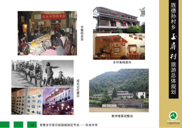 根据玉屏村旅游资源特点及其空间关联,依据文化脉络,现实与历史相结合,以仪电学校校址为基础,建设青春岁月昔日校园旅游区;以三线厂遗址为背景,打造燃烧岁月三线怀旧旅游区;依托玉屏村优美的度假环境,形成美好时光精彩玉屏旅游区;通过开展燕水河水上娱乐活动,建设从容岁月燕水河休闲旅游带;挖掘梅文化主题,建设文化之旅梅文化主题旅游区。并通过不同时代的记忆和现代美好乡村风光将各个景区相连接,形成怀旧与度假相结合的综合旅游区。